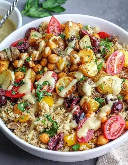 Roasted Potato, Spiced Chickpea & Vegetable Quinoa Salad w/ Creamy Vegan Honey Mustard Dressing